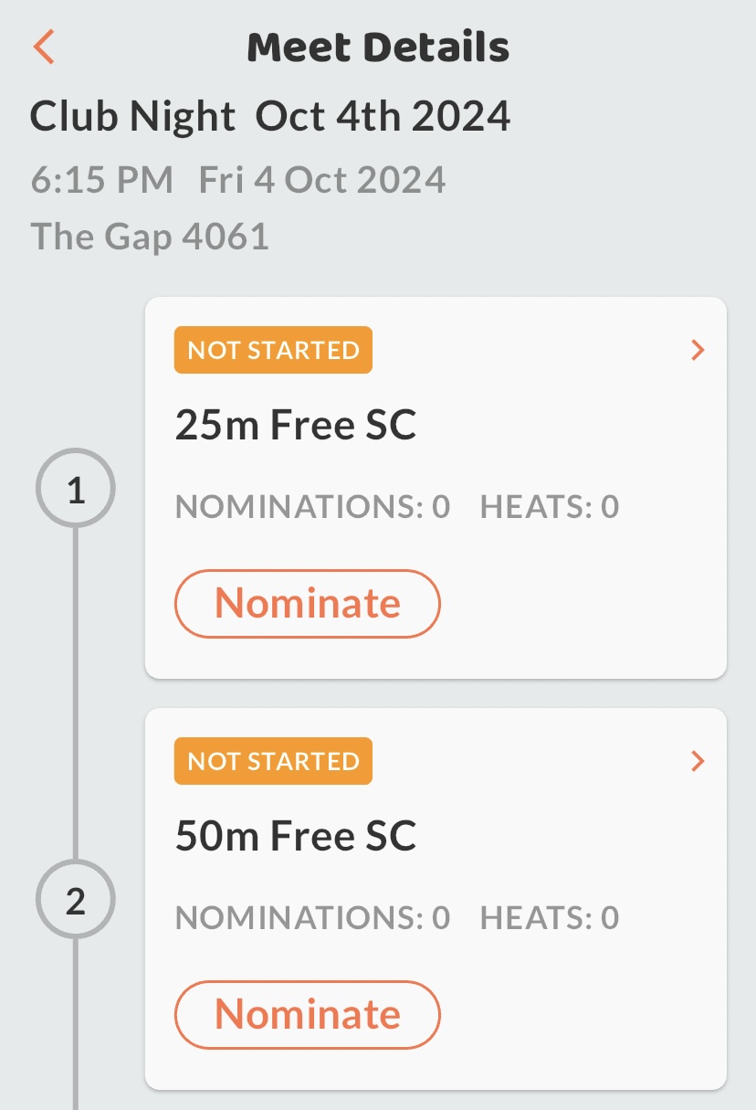 When nominating for an event for the first time, you must swim 25m events, until a seed time is recorded in the Swim Club Connect app. This doesn’t apply to IM.