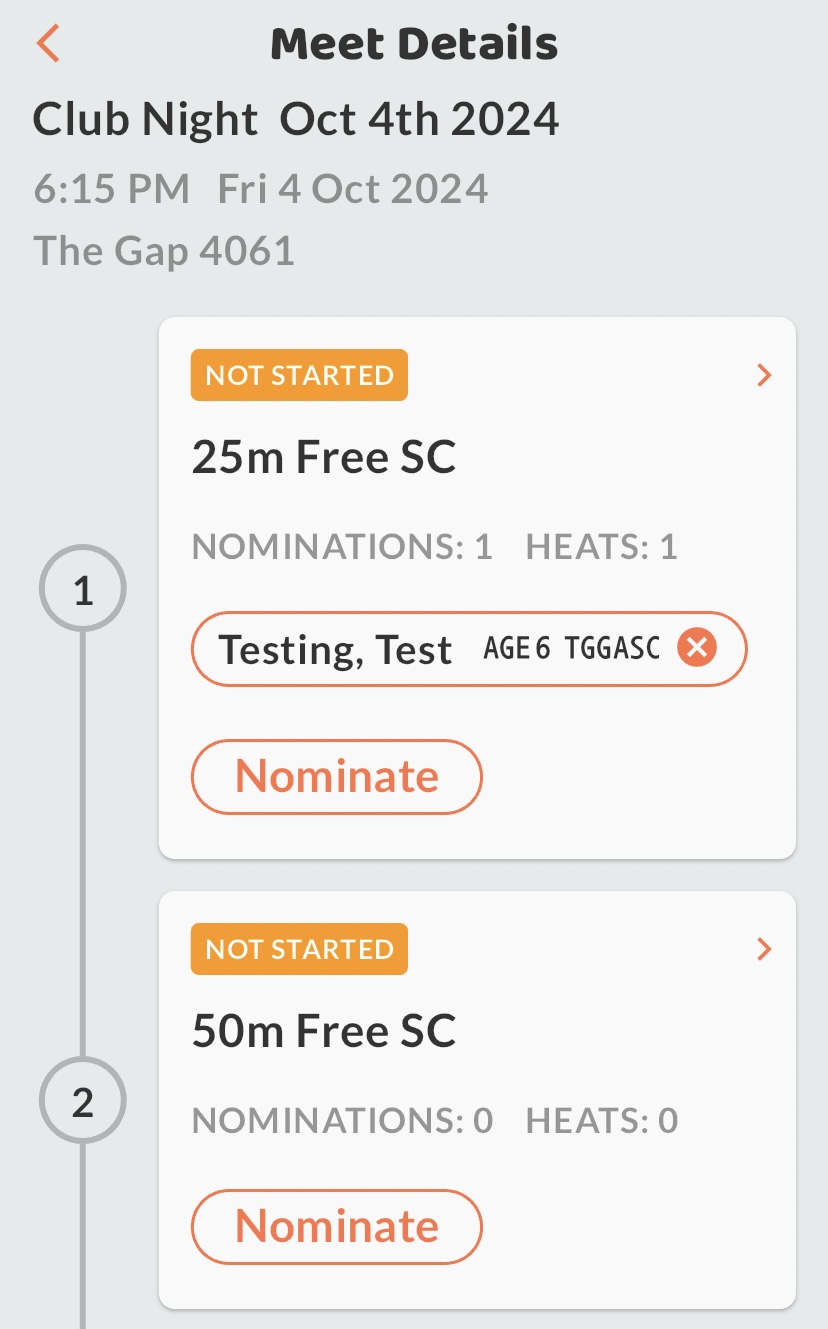 5. Your swimmer is now nominated for that event. You can nominate for as many or few events as you wish.